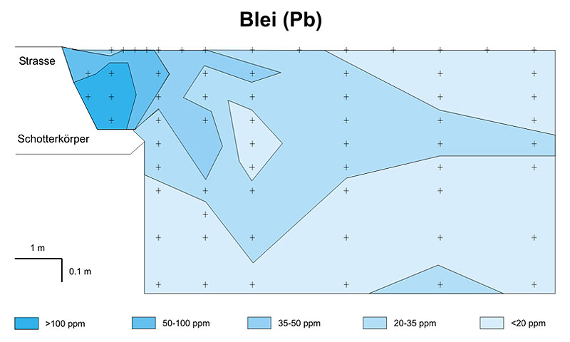 Beispiel einer Bleikartierung im Boden entlang der Autobahn A13 bei Chur; Profil senkrecht zur Autobahn, mit Tiefenzonierung; Röntgenfluoreszenz-XRF-Messung. Die höchsten Bleiwerte wurden unmittelbar am Strassenrand gemessen - in diesem Fall bis 175 ppm Pb. Der Bleieintrag erfolgte hauptsächlich über verbleites Benzin, welches in der Schweiz ab 1984 durch bleifreies Benzin ersetzt wurde und seit dem 1.1.2000 nicht mehr verkauft werden darf. Im Blei-Profil ist in 40 cm Tiefe eine Zone mit höherer Belastung vorhanden; diese dürfte durch oberflächliche Auswaschung und aufgrund des nachlassenden Blei-Eintrags entstanden sein.
