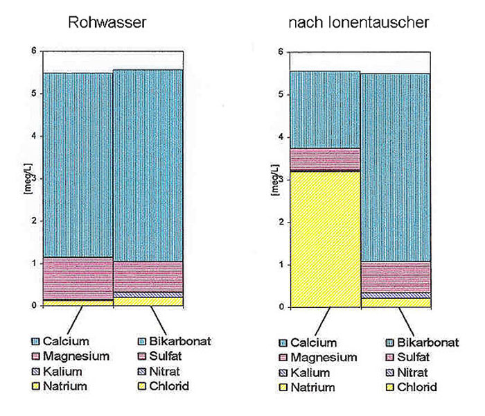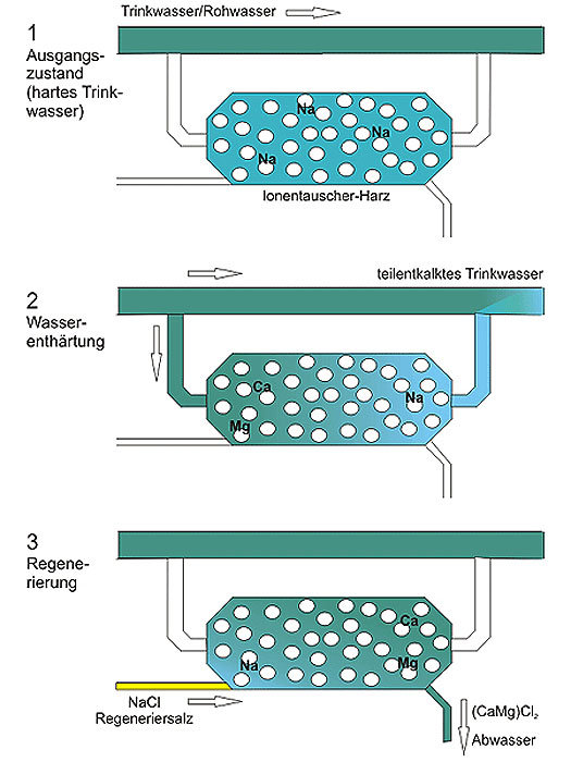 Der Ionenaustausch basiert darauf, dass dem Leitungswasser Calcium (Ca2+) und Magnesium-Ionen (Mg2+) entzogen werden und dafür durch Natrium (Na+) ersetzt werden.